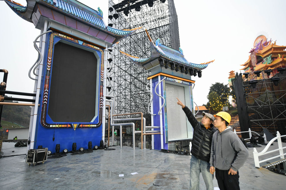 在第31屆自貢國(guó)際恐龍燈會(huì)主舞臺(tái)現(xiàn)場(chǎng),萬(wàn)松濤(左)與工作人員商討細(xì)節(jié),確保最終的呈現(xiàn)效果(1月14日攝)。
