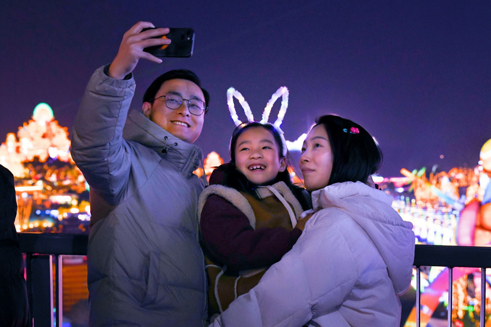 一家三代在第31屆自貢國(guó)際恐龍燈會(huì)試展上觀燈留影(1月14日攝)。