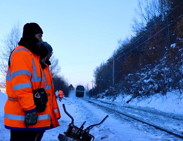 2月2日,小興安嶺,綏化工務(wù)段伊春二工隊(duì)班長田立鋒帶領(lǐng)6名青工對線路進(jìn)行整修后,一輛滿載貨物的列車通過。吳健/攝