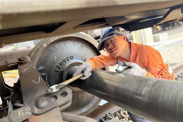 2月1日,中國鐵路南昌局集團(tuán)有限公司福州東車輛段廈門北運(yùn)用車間東孚作業(yè)場,檢車員邱龍?jiān)跈z查中歐班列。向帥/攝