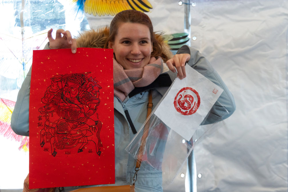 1月18日,一名女子在匈牙利首都布達(dá)佩斯舉行的新春廟會活動上手持木版年畫留影。新華社發(fā)(弗爾季·奧蒂洛攝)