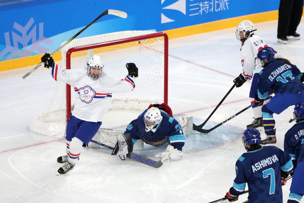 這里正在上演女子冰球B組一場(chǎng)焦點(diǎn)戰(zhàn),對(duì)陣雙方是中國(guó)臺(tái)北隊(duì)與哈薩克斯坦隊(duì),比賽開場(chǎng)第五分鐘,中國(guó)臺(tái)北隊(duì)就打入一球,進(jìn)球的68號(hào)球員雙臂高高舉起,和隊(duì)友一起慶祝,觀眾席傳來的,是山呼海嘯般的歡呼聲。