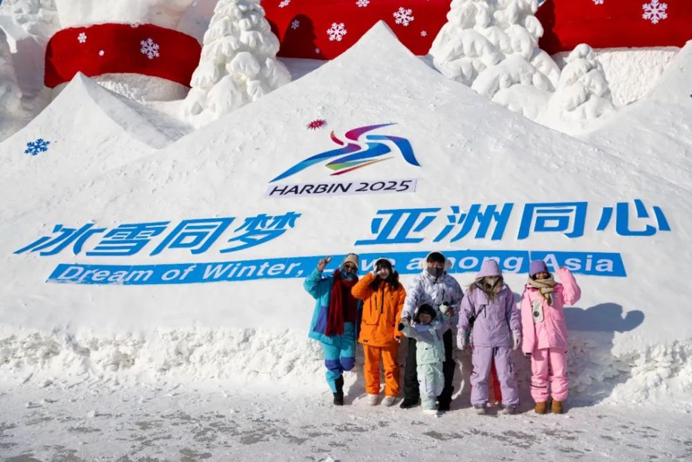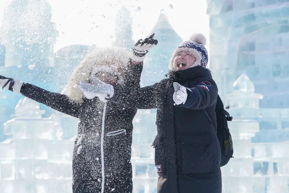 游客在哈爾濱冰雪大世界園區(qū)內(nèi)的冰建祈年殿旁邊游玩。