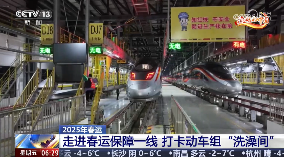 春運(yùn)期間,旅客平安出行的背后是數(shù)千組奔馳在祖國大江南北的動車組。白天,列車日行千里,而到了午夜時分,它們就進(jìn)入專屬的“保養(yǎng)驛站”進(jìn)行必要的清洗工作。從里到外,保潔員們連夜給列車好好地“洗個澡”,確保次日干凈上線。接下來,我們就跟隨記者的鏡頭一起去到江西南昌,打卡高鐵動車組的“洗澡間”。