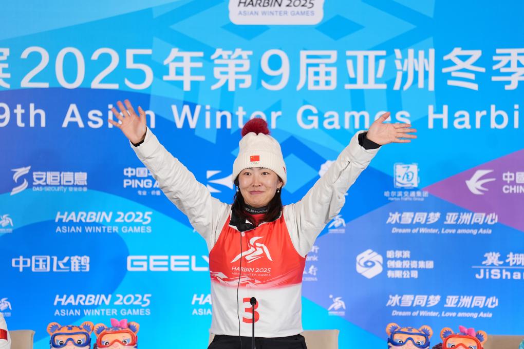 2月9日,中國選手徐夢桃在發(fā)布會現(xiàn)場。當日,第九屆亞冬會自由式滑雪女子個人空中技巧賽后新聞發(fā)布會在亞布力舉行。新華社記者 王松 攝