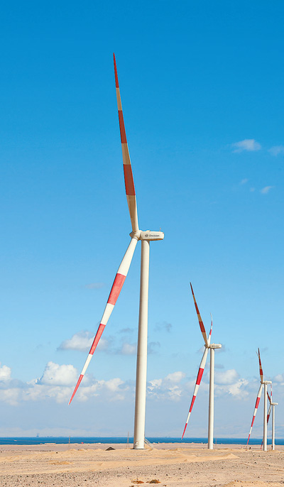 蘇伊士灣風(fēng)電項目位于埃及首都開羅以南約300公里的蘇伊士灣西岸小鎮(zhèn)拉斯·加里卜。項目共有77臺風(fēng)電機(jī)組,建成后預(yù)計每年可生產(chǎn)約27億千瓦時的清潔電力,實現(xiàn)二氧化碳減排約100萬噸。穆罕默德說:“在這片曠野上工作,把蘇伊士灣的風(fēng)轉(zhuǎn)化成電能,‘點亮’萬家燈火,我感到十分驕傲?!?/p>