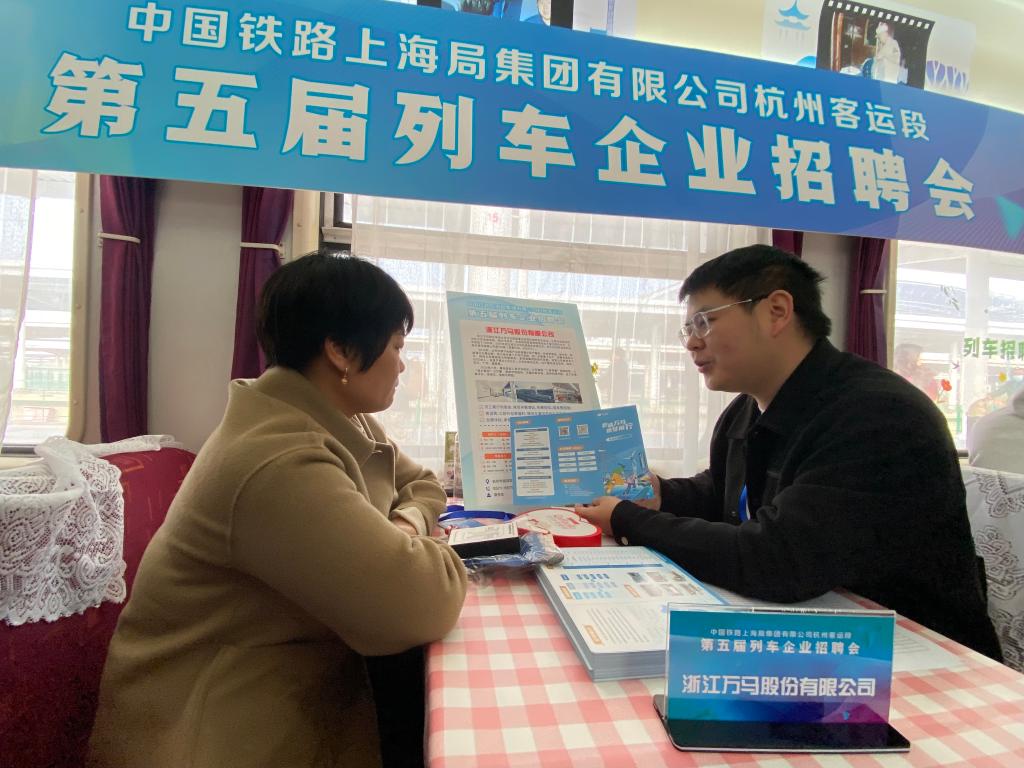 杭州客運段甬廣車隊黨總支書記朱秦予介紹,當天除了在K210次列車設(shè)置企業(yè)一對一招聘臺,列車工作人員還通過網(wǎng)絡(luò)直播,在西安開往寧波的K468次、蘭州開往杭州的T114次等列車上同步開展線上招聘會,為更多旅客提供崗位選擇。