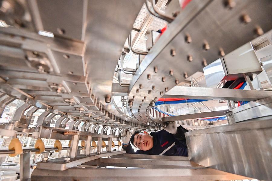2月14日,在山東省青州經(jīng)濟(jì)開發(fā)區(qū)一家灌裝設(shè)備制造企業(yè),工人在車間內(nèi)裝配作業(yè)。新華社發(fā)(王繼林?jǐn)z)