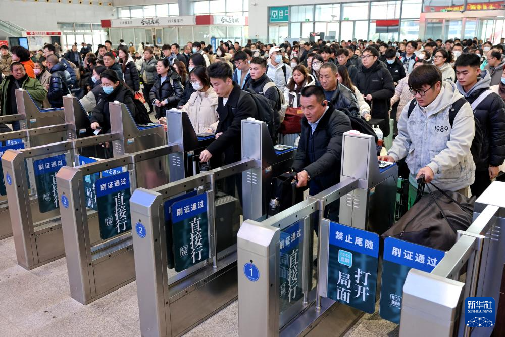 圖為2月22日,旅客在山東棗莊站通過閘機檢票進(jìn)站。