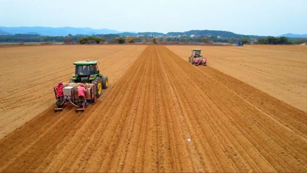 2月19日,在廣西來賓市興賓區(qū)鳳凰鎮(zhèn)國家現(xiàn)代農(nóng)業(yè)產(chǎn)業(yè)園黃安優(yōu)質(zhì)“雙高”糖料蔗基地,七臺大型拖拉機(jī)、甘蔗種植機(jī)并列同步作業(yè),蔗農(nóng)有條不紊地往入口糟插入蔗苗,機(jī)器自動完成植苗、蓋膜、覆土工作,不到15分鐘,兩壟長約200米的甘蔗全部種植完畢。