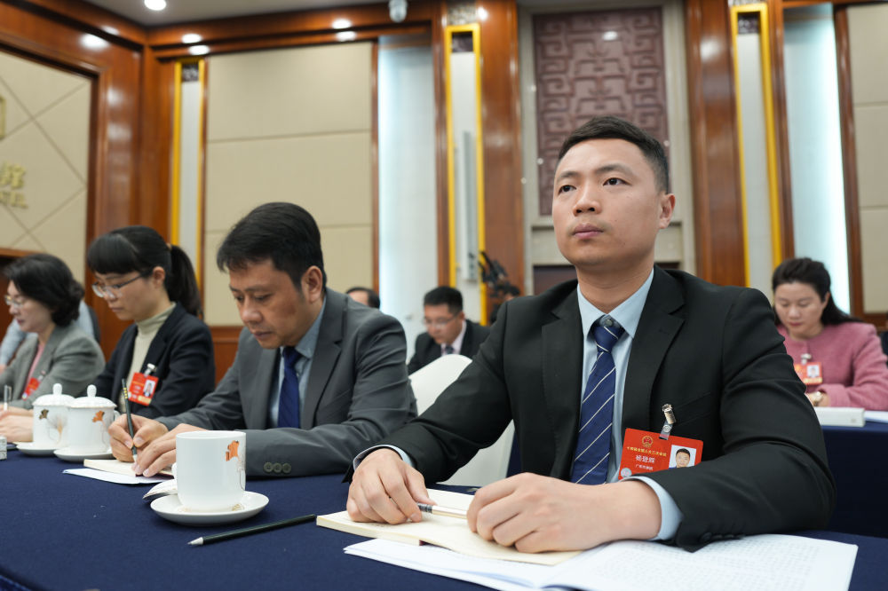 楊登輝(前右一)在十四屆全國(guó)人大三次會(huì)議廣東代表團(tuán)全體會(huì)議上認(rèn)真聽取發(fā)言。