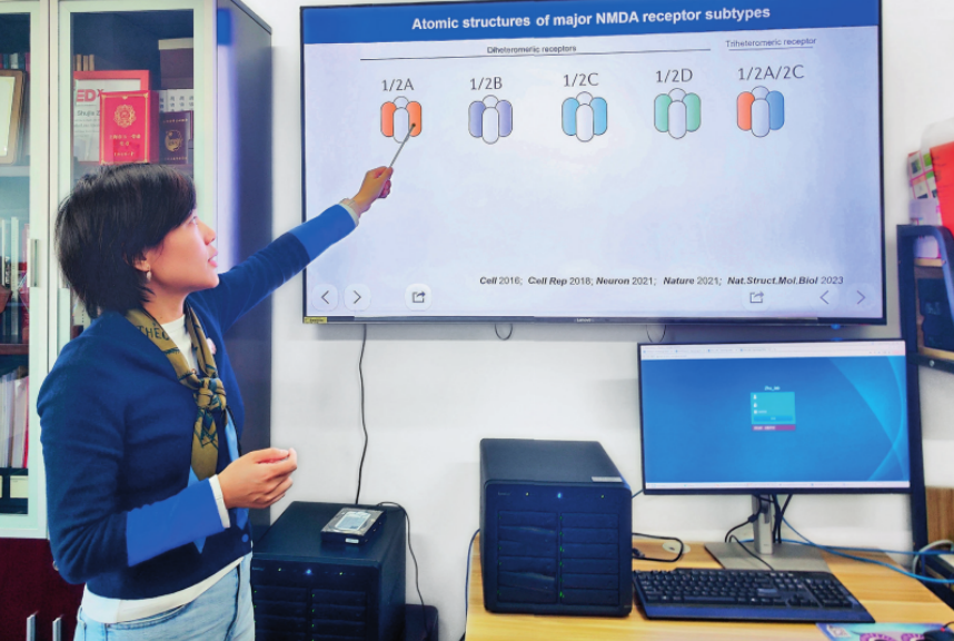 竺淑佳向記者介紹團隊聚焦的NMDA受體相關(guān)研究(2025年1月攝)。董雪攝/本刊