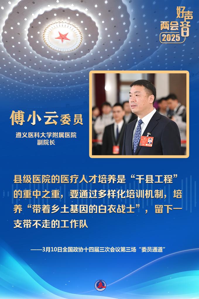 “國(guó)家持續(xù)實(shí)施‘千縣工程’,開(kāi)展醫(yī)療人才‘組團(tuán)式’支援幫扶,支援西藏、新疆、青海等地區(qū)醫(yī)院和國(guó)家鄉(xiāng)村振興重點(diǎn)幫扶縣人民醫(yī)院。”遵義醫(yī)科大學(xué)附屬醫(yī)院副院長(zhǎng)傅小云委員說(shuō)。