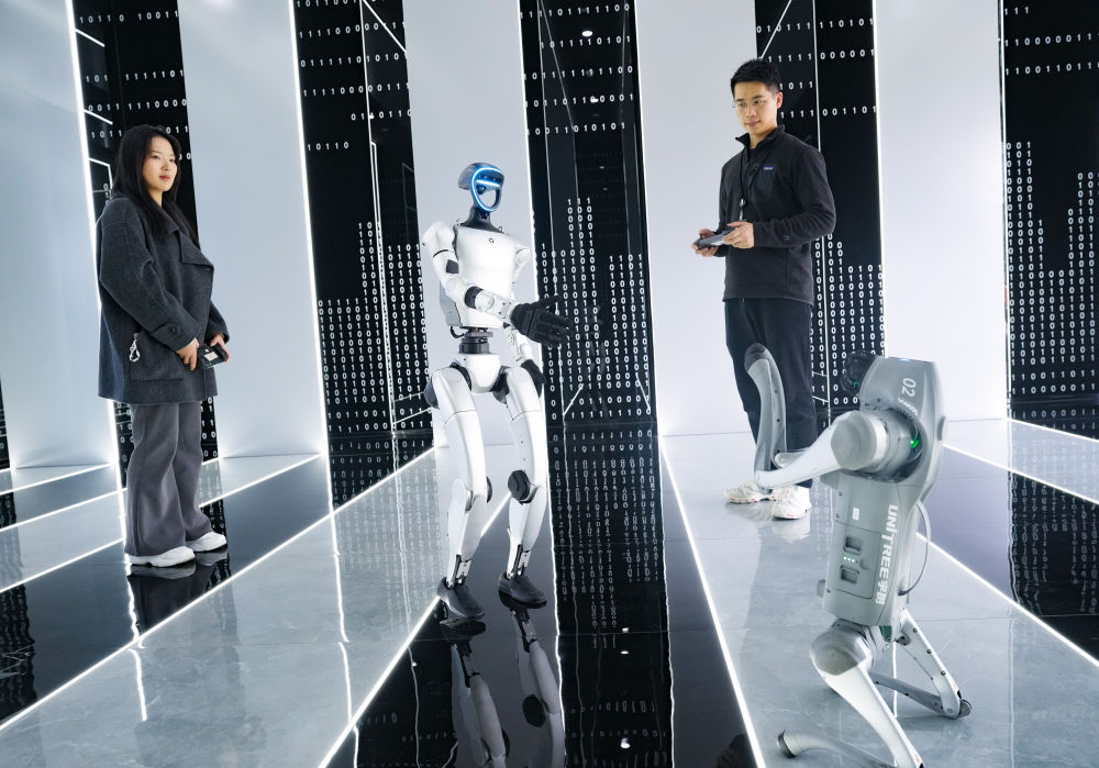 3月1日,在杭州宇樹(shù)科技有限公司的產(chǎn)品展示中心,人形機(jī)器人和四足機(jī)器人在工作人員控制下做動(dòng)作。新華社記者 翁忻旸 攝