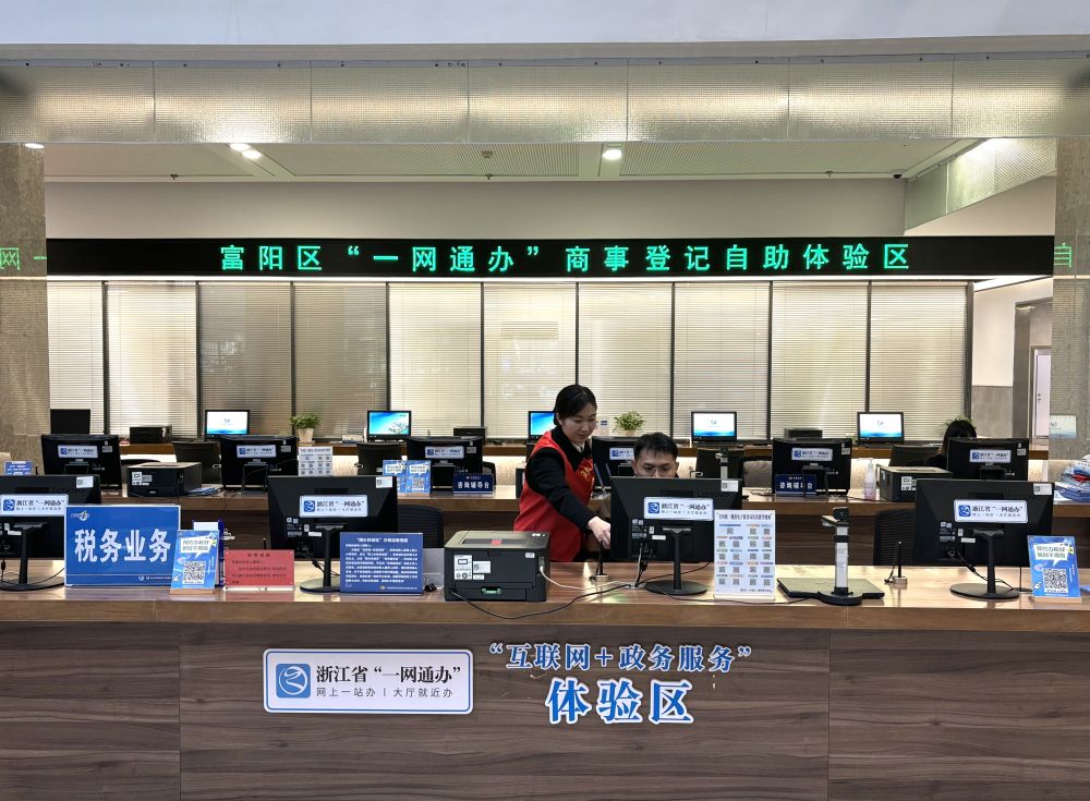 2月18日,在杭州市富陽(yáng)區(qū)政務(wù)服務(wù)中心,工作人員引導(dǎo)群眾自助辦理“一網(wǎng)通辦”事項(xiàng)。(受訪單位供圖)
