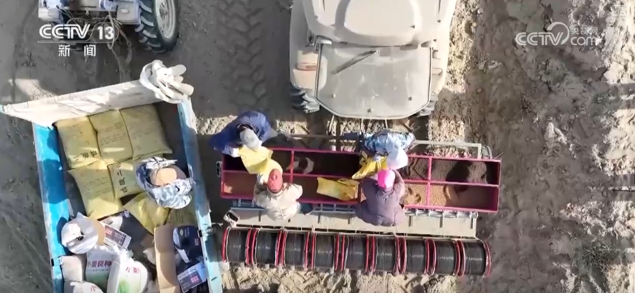 在酒泉金塔縣東壩鎮(zhèn)小河口村的這片麥田,多臺小麥播種機(jī)在田間作業(yè)。針對當(dāng)?shù)馗珊等庇甑臍夂蛱攸c(diǎn),2025年,當(dāng)?shù)夭捎脺\埋滴灌水肥一體化技術(shù),實(shí)現(xiàn)機(jī)械化播種。