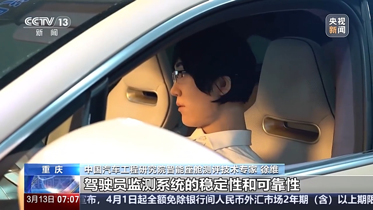 中國汽車工程研究院智能座艙測(cè)評(píng)技術(shù)專家 徐維:這個(gè)仿生機(jī)器人可以去模擬駕駛員的一些手勢(shì)動(dòng)作,同時(shí)可以模擬我們眨眼睛、微笑等一些微表情,從而快速去檢測(cè)我們駕駛員監(jiān)測(cè)系統(tǒng)的穩(wěn)定性和可靠性。