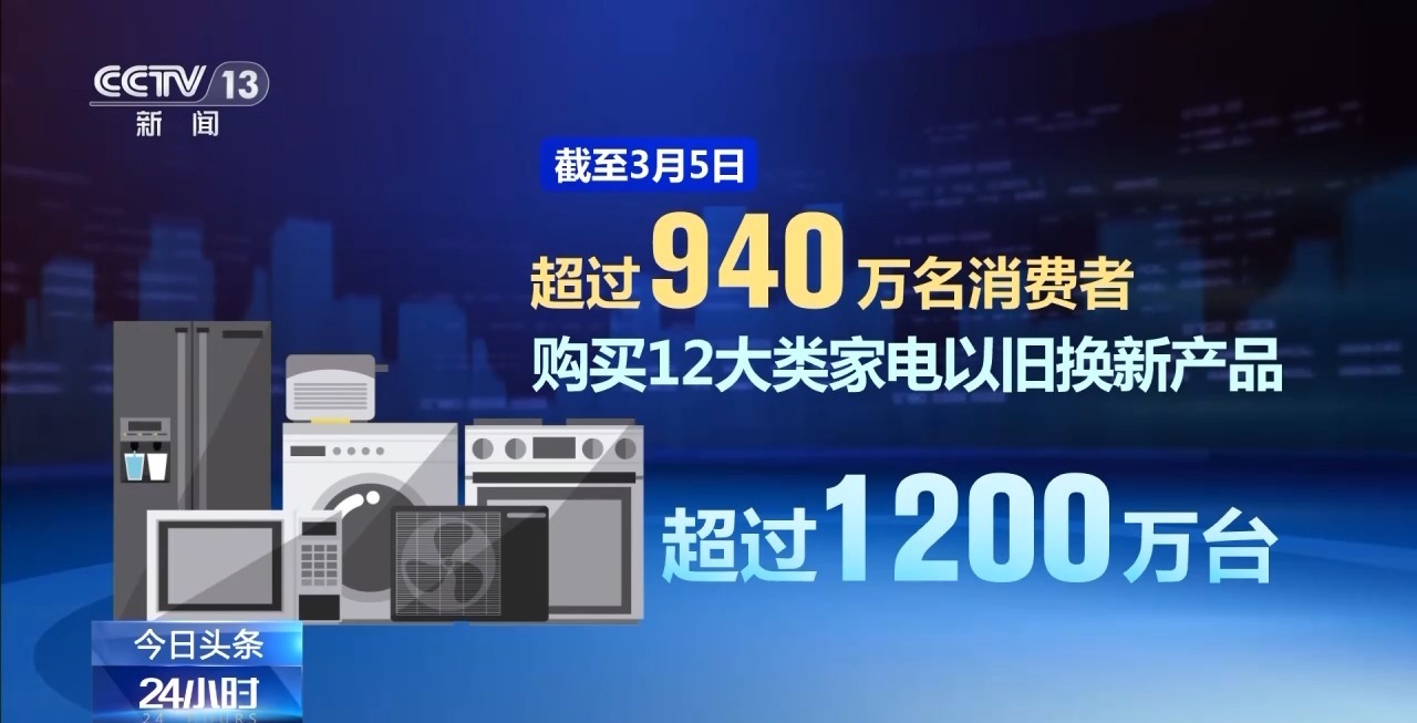 商務部數(shù)據(jù)顯示,截至3月5日,超過940萬名消費者購買12大類家電以舊換新產(chǎn)品超過1200萬臺,已有超過3400萬名消費者申請了超過4200萬件手機等數(shù)碼產(chǎn)品購新補貼。