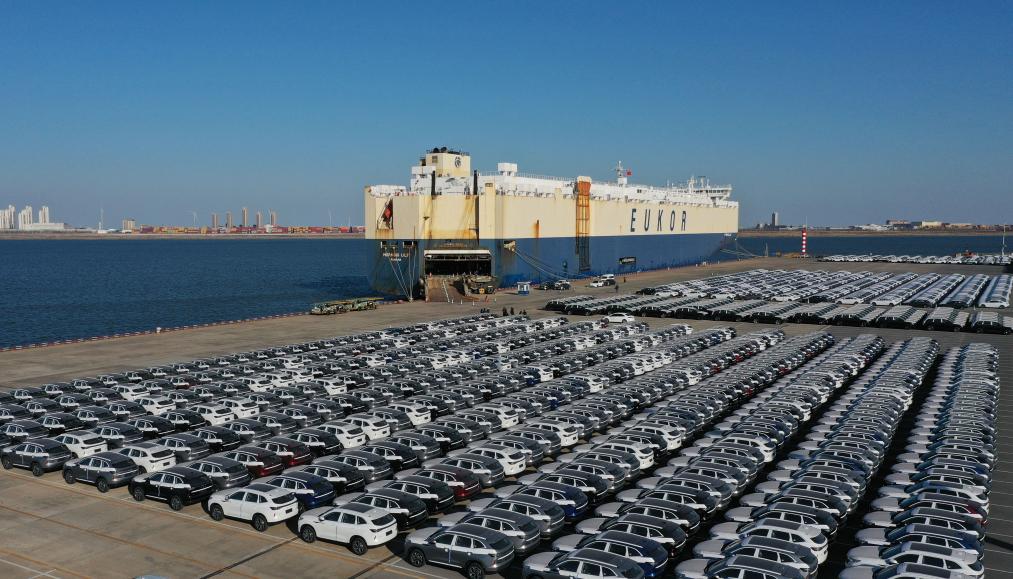 2025年2月25日,來(lái)自京津冀地區(qū)的超4000輛國(guó)產(chǎn)自主品牌汽車在天津港環(huán)球滾裝碼頭等待裝船發(fā)往海外(無(wú)人機(jī)照片)。新華社記者 趙子碩 攝