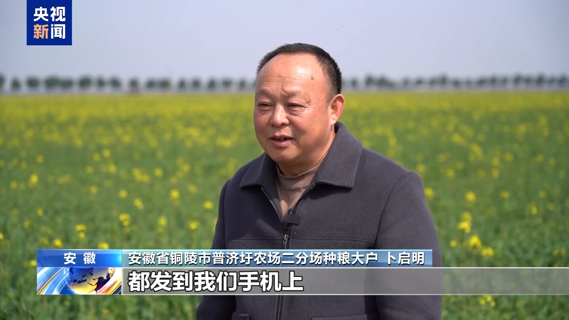 安徽省銅陵市普濟(jì)圩農(nóng)場二分場種糧大戶 卜啟明:以前我們種糧靠天收,在電視上看天氣預(yù)報(bào),現(xiàn)在科技發(fā)達(dá)了,都發(fā)到我們手機(jī)上。