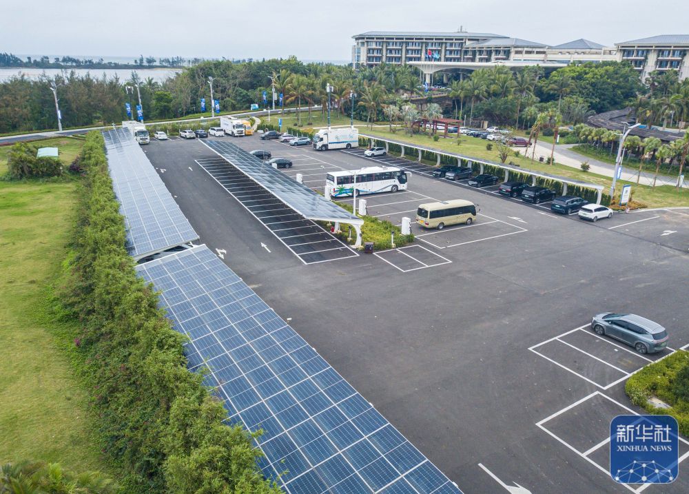 ↑ 在博鰲零碳示范區(qū)拍攝的建有光伏發(fā)電設(shè)備的停車場(無人機照片,3月16日攝)。