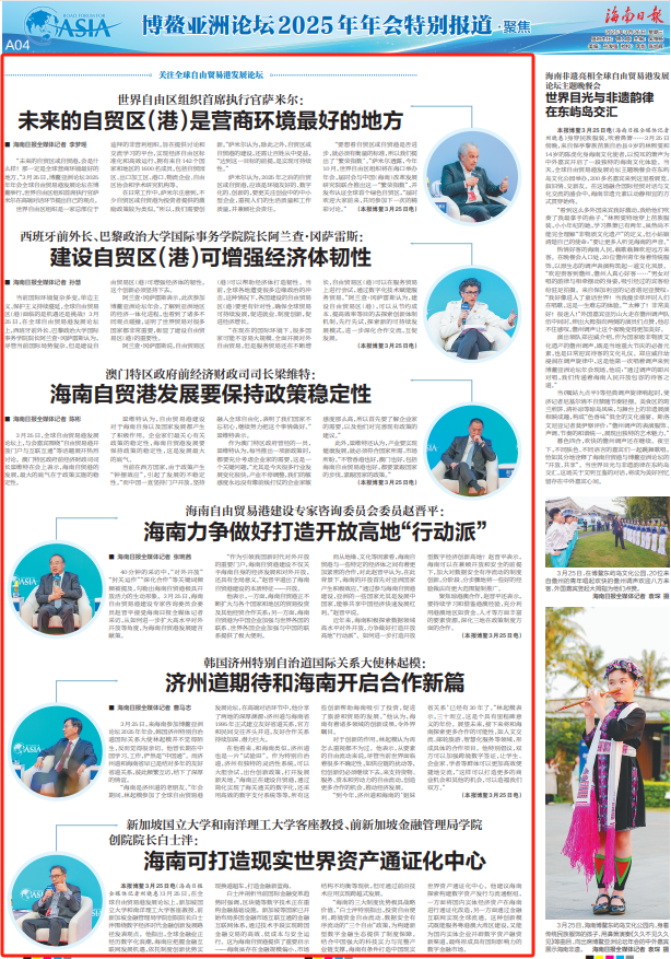 2025年是海南自貿(mào)港封關(guān)運作、擴大開放之年。當天,與會嘉賓圍繞“自由貿(mào)易港賦能全球經(jīng)貿(mào)合作”“自由貿(mào)易港引領(lǐng)全球自由貿(mào)易進程”“自由貿(mào)易港開放門戶與互聯(lián)互通”等議題進行深入交流探討,共同描繪自貿(mào)港發(fā)展新藍圖,為海南自貿(mào)港建設貢獻“博鰲智慧”。