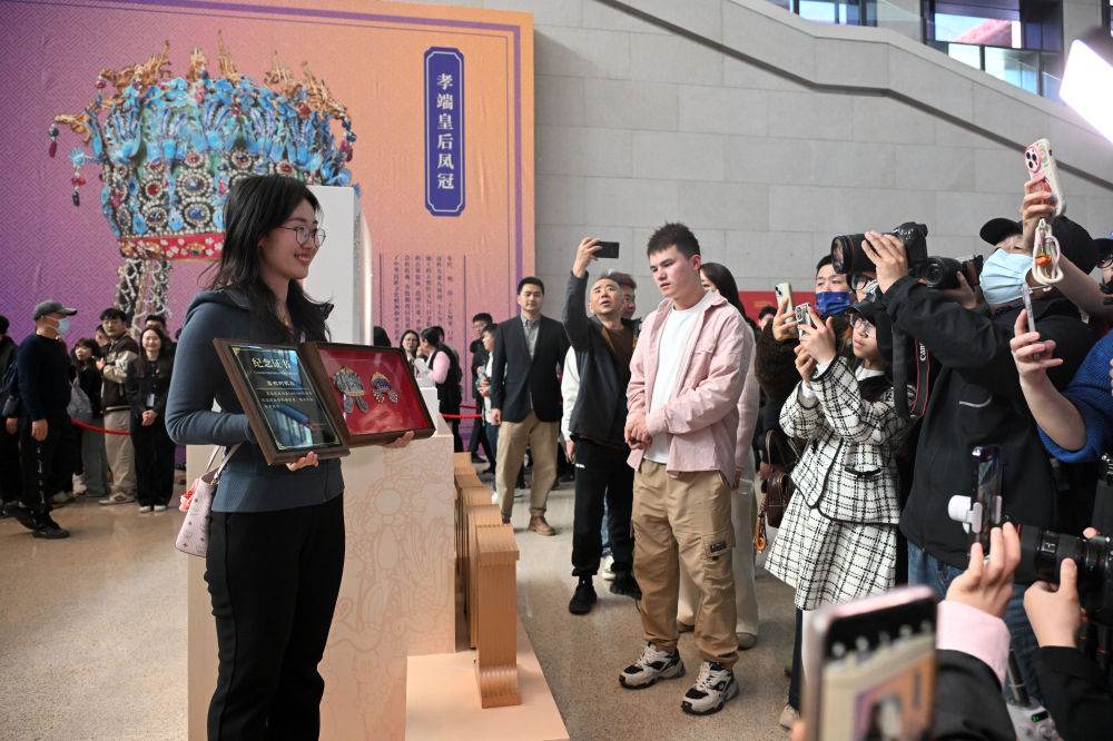 當(dāng)日,國(guó)博文創(chuàng)團(tuán)隊(duì)將“紀(jì)念款鳳冠冰箱貼”和紀(jì)念證書贈(zèng)送給第100萬(wàn)件鳳冠冰箱貼的購(gòu)買者——來(lái)自山東東營(yíng)的“95后”觀眾李雅菲。