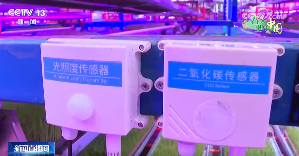 來到這個(gè)育秧車間,我們可以看到現(xiàn)在的秧苗都已經(jīng)坐上電梯了。在立體循環(huán)育秧架上,一盤盤綠油油的秧苗坐著升降梯輪流接受光照。架子上還裝有智能傳感器,把溫度、濕度等信息實(shí)時(shí)顯示在大屏上。同時(shí),還可以用手機(jī)進(jìn)行遠(yuǎn)程操控,根據(jù)秧苗長勢(shì)自動(dòng)進(jìn)行補(bǔ)光、噴淋。