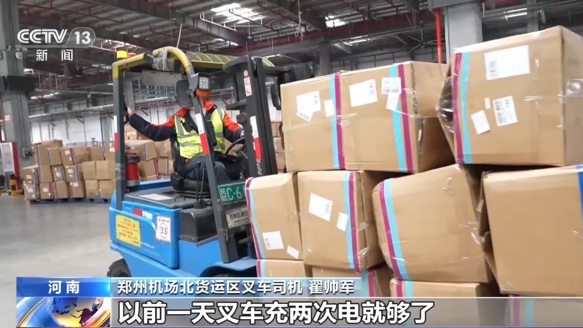 鄭州機(jī)場(chǎng)北貨運(yùn)區(qū)叉車司機(jī) 翟帥軍:飛機(jī)航班多不多,裝得滿不滿,看我這邊就知道,以前一天叉車充兩次電就夠了,現(xiàn)在要充四次電。