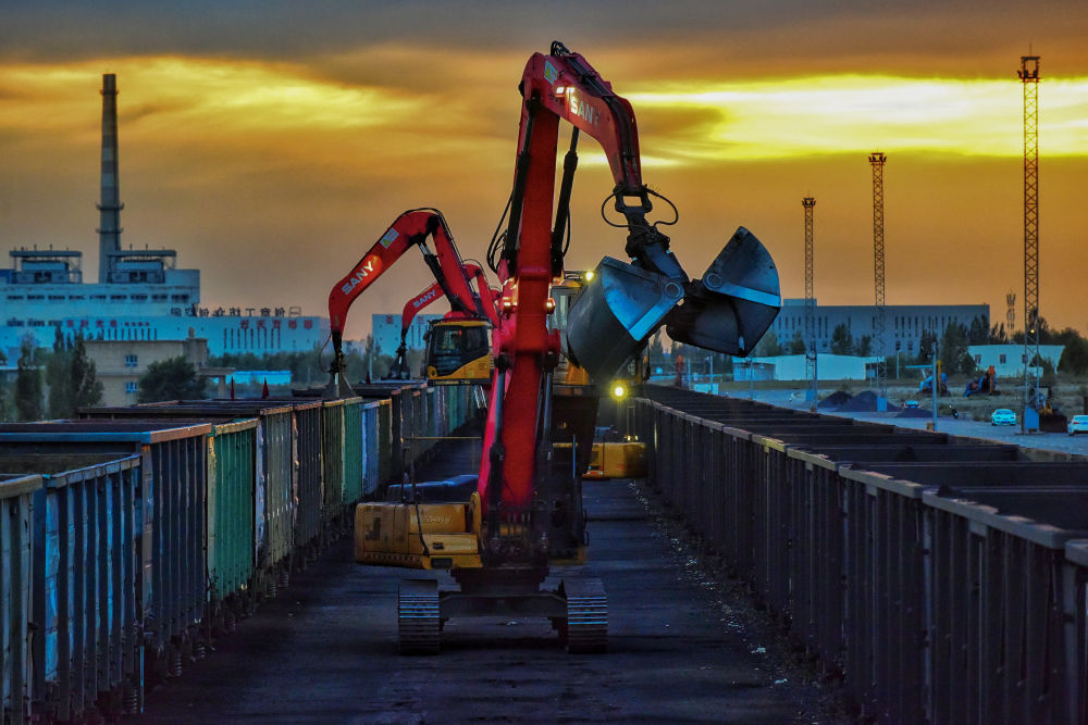 新疆霍爾果斯站換裝庫換十線抓料機(jī)對散堆裝貨物換裝作業(yè)(2023年9月6日攝)。新華社記者 趙戈 攝