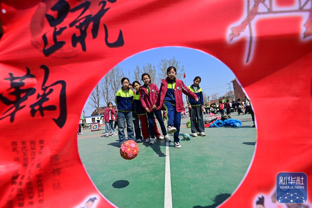 ↑ 4月3日,在河南省焦作市博愛縣清化鎮(zhèn)街道七街小學(xué),學(xué)生們在體驗蹴鞠。新華社發(fā)(程全攝)