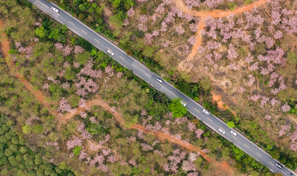 游客驅(qū)車前來(lái)清鎮(zhèn)市紅楓湖鎮(zhèn)右二村踏青游玩(4月5日攝,無(wú)人機(jī)照片)。新華社記者 陶亮 攝