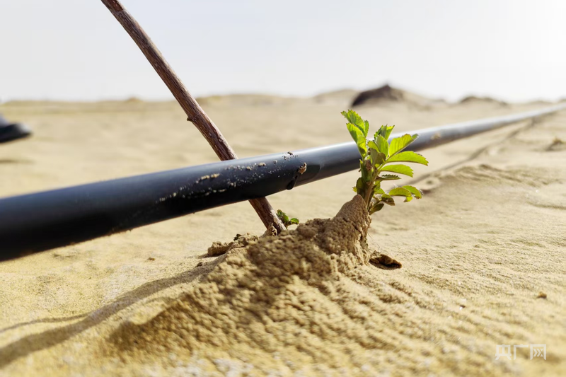 數(shù)臺推土機以磅礴之勢推平連綿沙丘,為綠色的希望開辟道路;林草技術中心的技術人員與護林員協(xié)作栽種耐旱中草藥苗,每個動作都飽含著對這片沙地的期待;去年完成塔克拉瑪干鎖邊合龍的區(qū)域,沙漠玫瑰沖破沙層露出新芽;滴灌帶的水滴有序落下,滋潤著這片干涸的沙漠,像一條條生命的脈絡延伸在廣袤沙?!?/p>