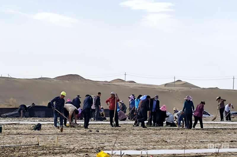 在民豐縣防沙治沙試驗站,林草技術中心的技術人員與護林員協(xié)作栽種耐旱中草藥苗 (央廣網(wǎng)發(fā) 馬曉杉 攝)