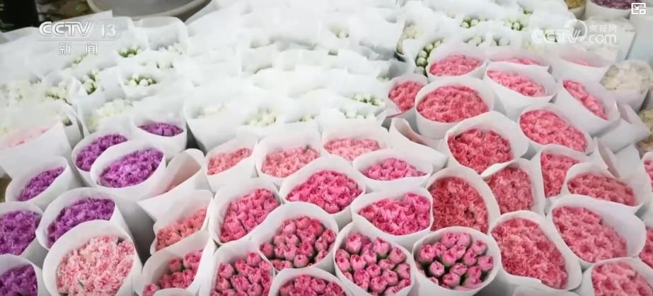 在昆明一家花卉貿(mào)易公司,記者看到,工人們正加班加點(diǎn)對剛剛集中采購回來的康乃馨進(jìn)行二次分級包裝。