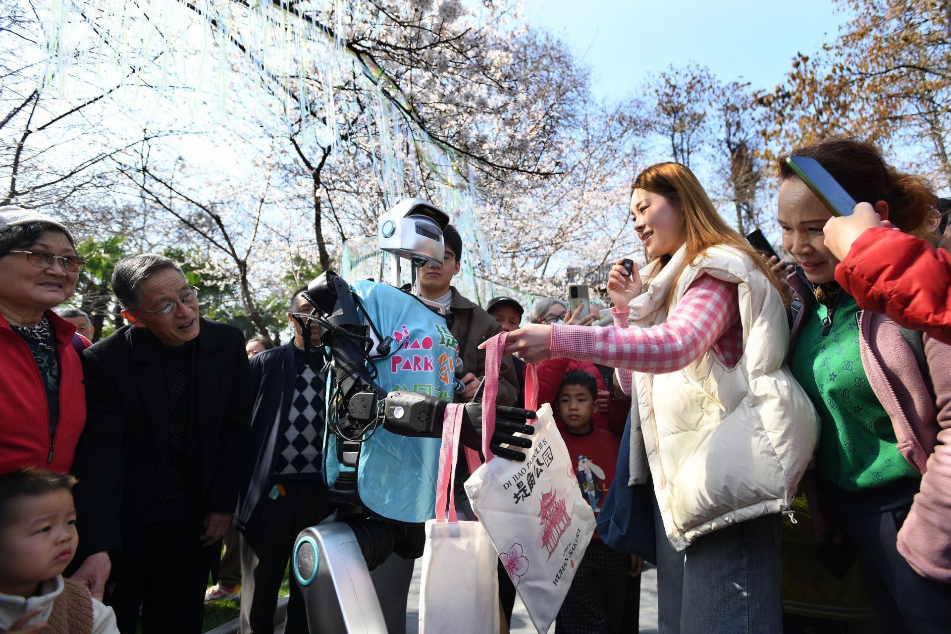 3月19日,堤角公園,人形機器人“小天”穿過櫻花云廊,精準(zhǔn)避開奔跑的孩童。