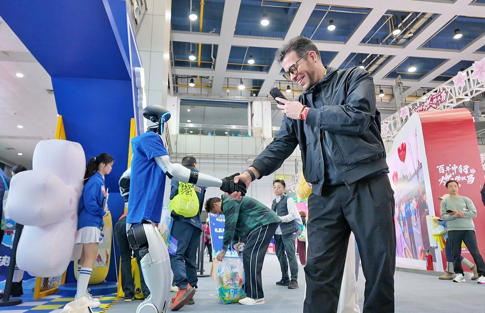 3月20日,在武漢國際會展中心,2025武漢馬拉松迎來了首個參賽選手報到領(lǐng)物日。委內(nèi)瑞拉選手吳瑞龍看見人形機器人志愿者,開心地上前與它握手。