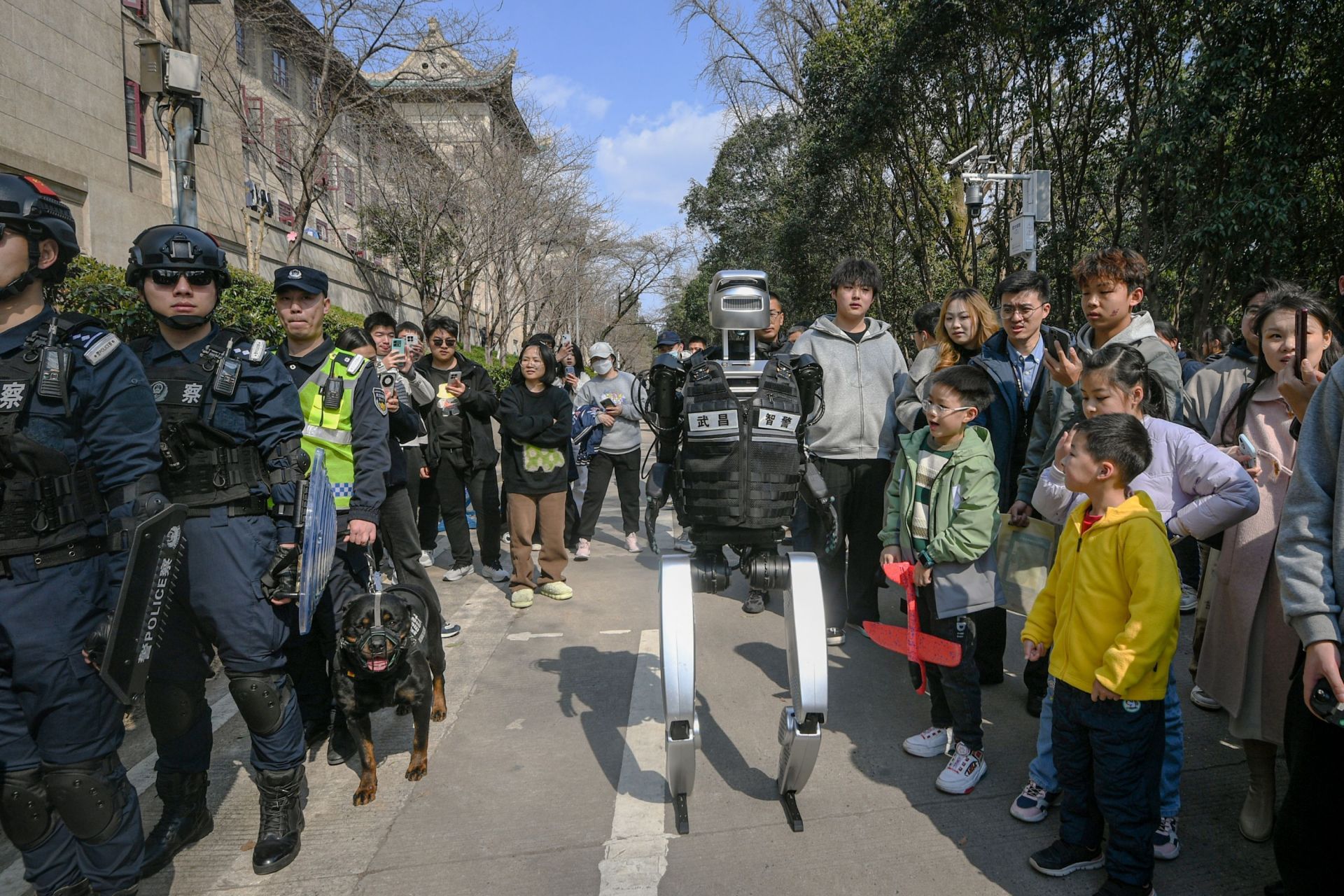 3月16日,武漢大學(xué)櫻花大道上,一臺身著黑色馬甲的人形機器人“智警小珞”穿梭在賞櫻人群中。