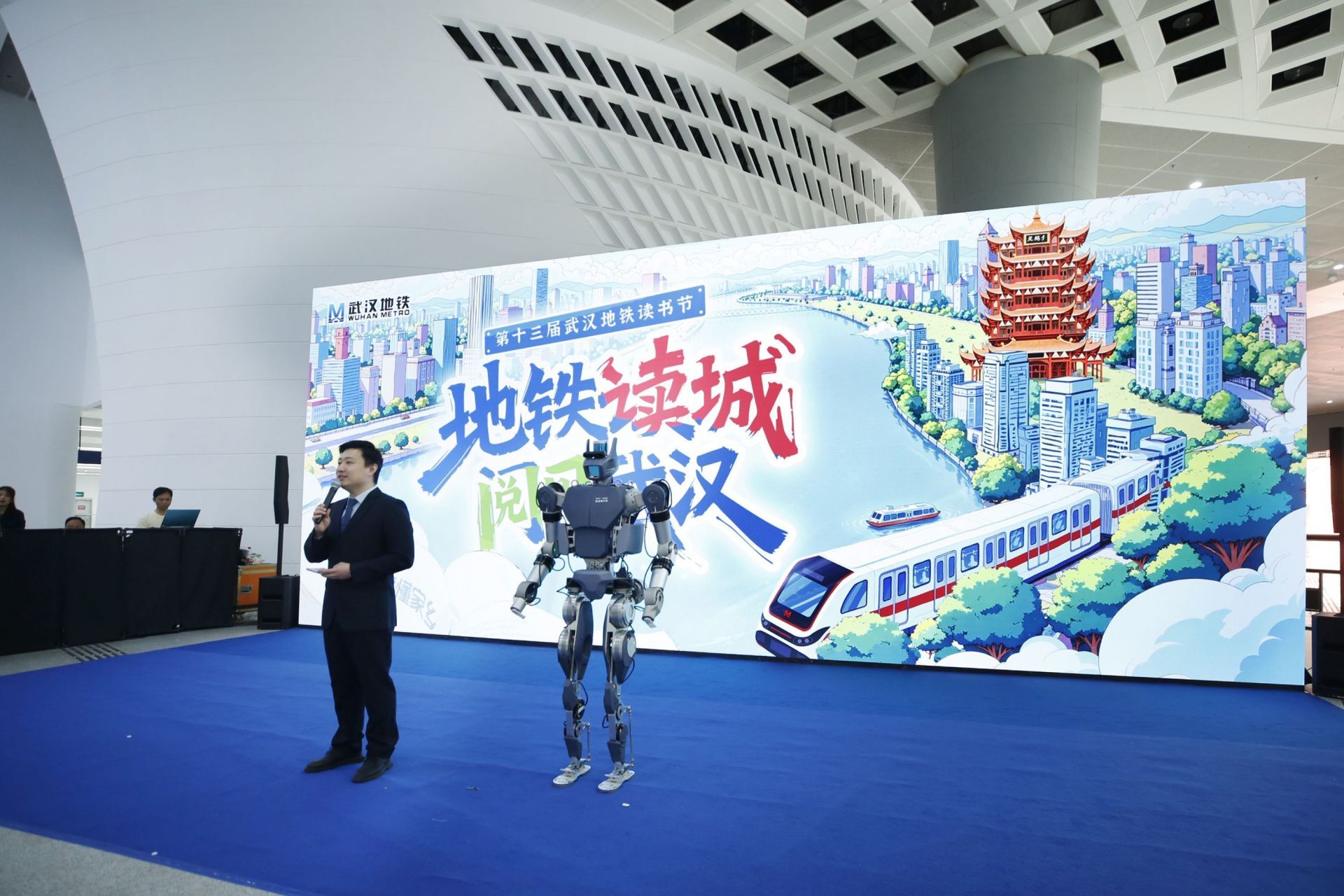 4月10日,第十三屆武漢地鐵讀書節(jié)活動在光谷廣場環(huán)形站廳拉開帷幕,由華中科技大學(xué)陳學(xué)東院士團隊與武漢格藍若共同研制,擁有出色負載能力的湖北明星機器人“勞動者3號”登上主舞臺,擔(dān)任活動嘉賓主持。