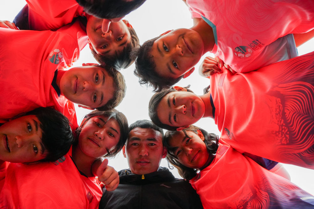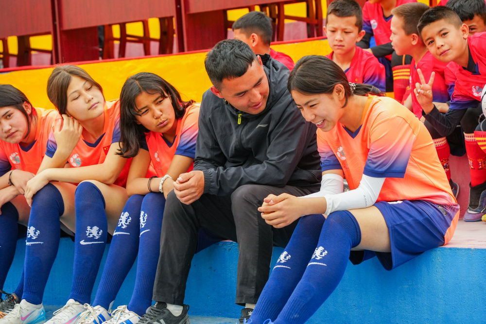 ↑4月12日,在2025新疆克孜勒蘇柯爾克孜自治州足球聯(lián)賽開幕式后,中國足協(xié)副主席、前中國國家女子足球隊球員孫雯(前)與阿圖什市U13女子足球隊合影。新華社記者 徐宏巖 攝