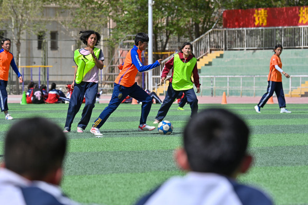 ↑4月10日,在阿圖什市硝魯克中學(xué),球隊中場球員帕提麥·肉孜買買提(左)在進(jìn)行運(yùn)球訓(xùn)練。新華社記者 徐宏巖 攝