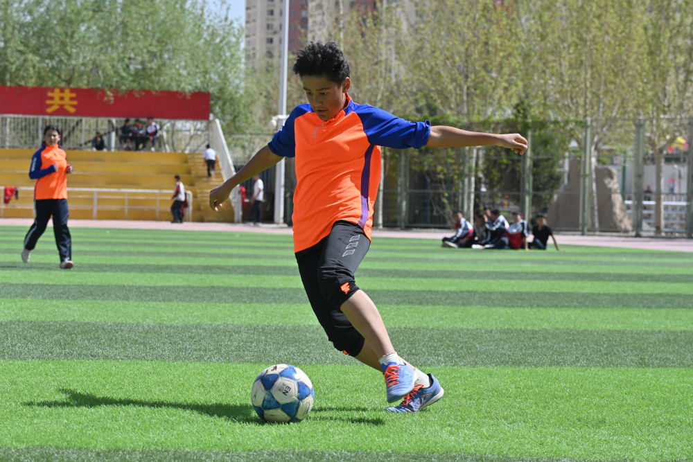 ↑在阿圖什市硝魯克中學(xué),球隊前鋒謝爾克努爾·亞力坤在訓(xùn)練賽中帶球進(jìn)攻。新華社記者 徐宏巖 攝