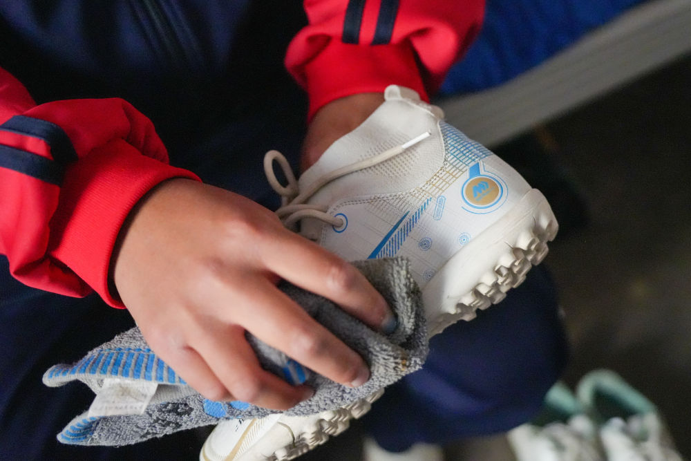 ↑4月10日,在阿圖什市硝魯克中學(xué)宿舍,一名球隊球員在擦拭自己心愛的球鞋。球員們的裝備由學(xué)校免費(fèi)發(fā)放。新華社記者 徐宏巖 攝