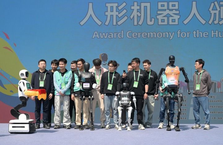 2025年4月19日,一臺機器人在人形機器人頒獎儀式上托舉著獎牌走向獲獎機器人選手和技術(shù)團隊。當日,2025北京亦莊半程馬拉松暨人形機器人半程馬拉松舉行。新華社記者 李賀 攝