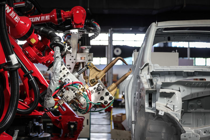 2024年6月3日拍攝的點焊機器人。機器人被廣泛應(yīng)用于工業(yè),它們能夠勝任繁重、危險或復雜的工作,提高生產(chǎn)效率和經(jīng)濟效益。新華社記者 潘昱龍 攝