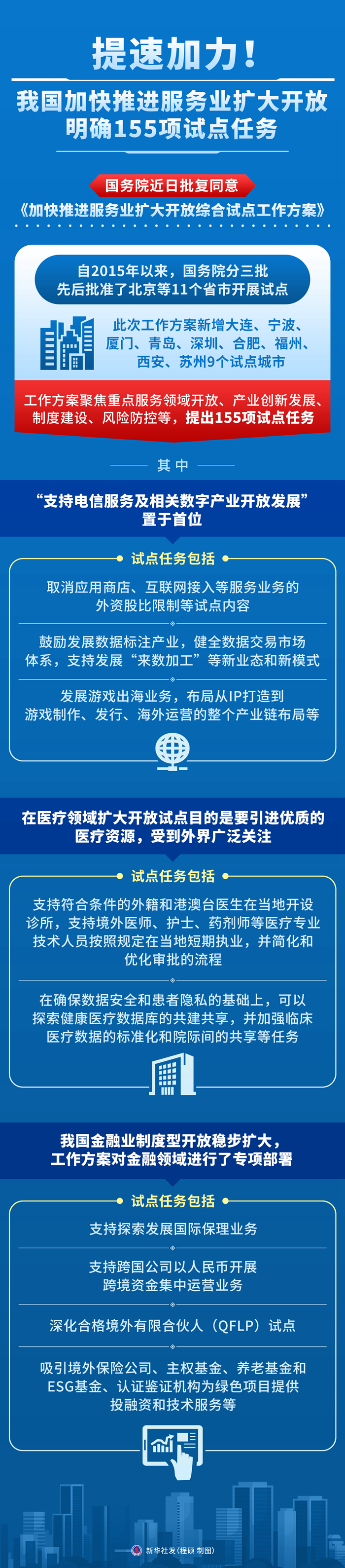 具體來(lái)看,工作方案聚焦重點(diǎn)服務(wù)領(lǐng)域開(kāi)放、產(chǎn)業(yè)創(chuàng)新發(fā)展、制度建設(shè)、風(fēng)險(xiǎn)防控等,提出155項(xiàng)試點(diǎn)任務(wù)。