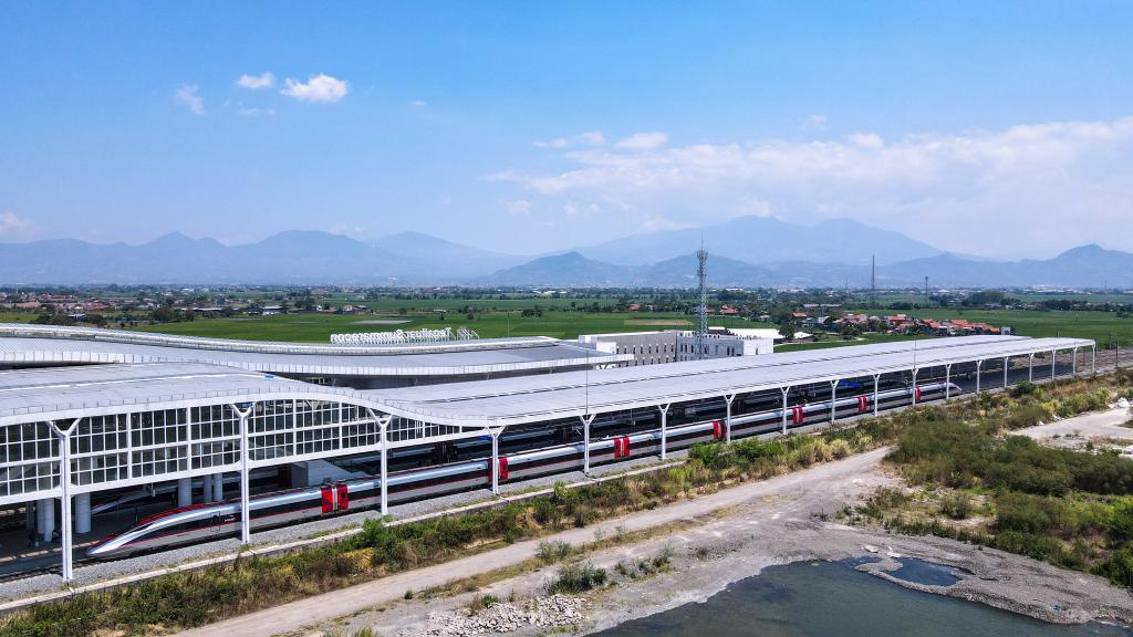 圖為2024年9月13日在印度尼西亞萬(wàn)隆德卡魯爾站拍攝的停靠在站臺(tái)上的雅萬(wàn)高鐵高速動(dòng)車組(無人機(jī)照片)。新華社記者徐欽攝