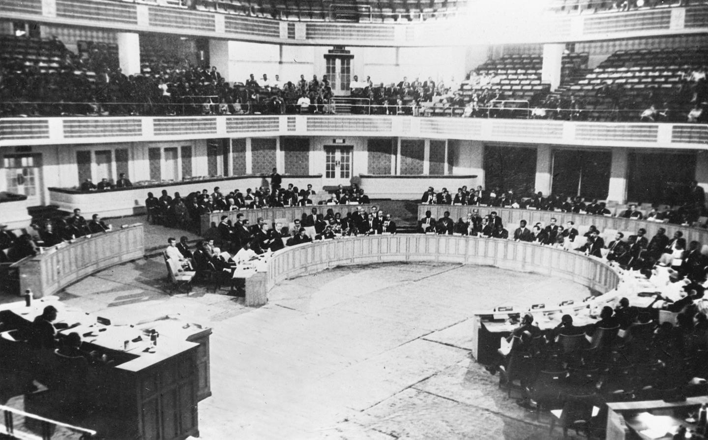 1955年4月18日至24日,29個(gè)亞非國(guó)家和地區(qū)的政府代表團(tuán)在印度尼西亞萬(wàn)隆召開亞非會(huì)議。圖為萬(wàn)隆亞非會(huì)議會(huì)場(chǎng)內(nèi)景。新華社記者錢嗣杰攝
