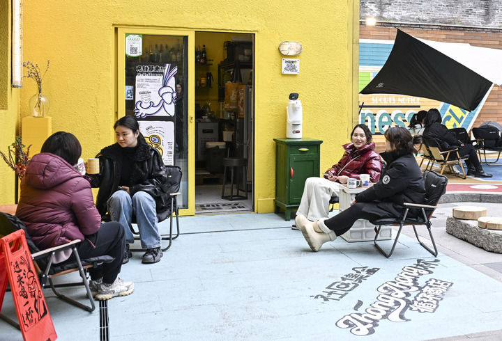 消費(fèi)者在重慶市江北區(qū)大石壩街道忠恕沱社區(qū)一飲品店外休閑、聊天(2月24日攝)。新華社記者王全超攝