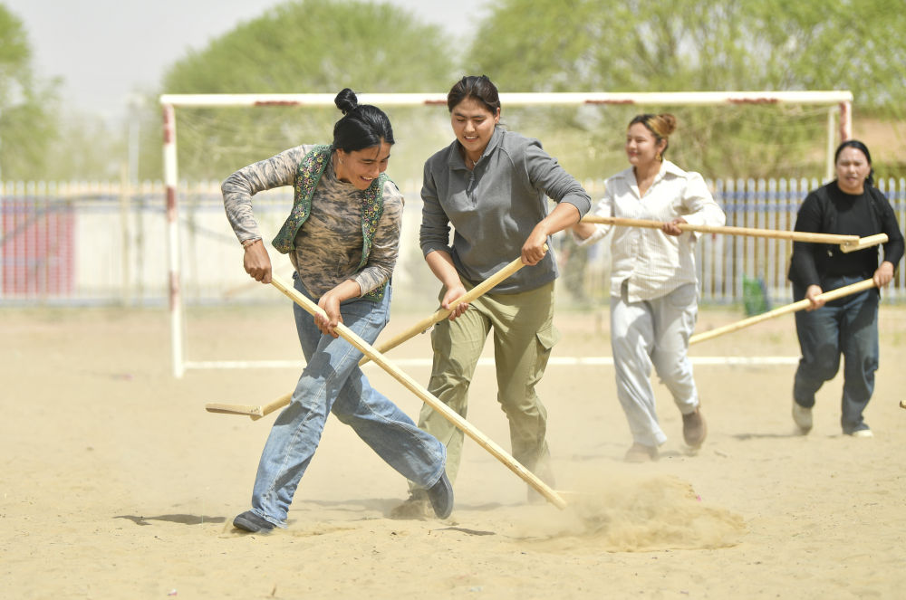 達(dá)里雅布依鄉(xiāng)女子麥熱球隊的訓(xùn)練場地,就是一片被胡楊、紅柳包圍著的沙地操場。麥熱球類似曲棍球,是一種在新疆和田地區(qū)廣泛流行的古老運動。這項群眾性運動并沒有過于嚴(yán)格的規(guī)則,一片空地,三五好友,興之所起,即可揮桿。2021年,麥熱球被正式列入國家級非物質(zhì)文化遺產(chǎn)代表性項目名錄。
